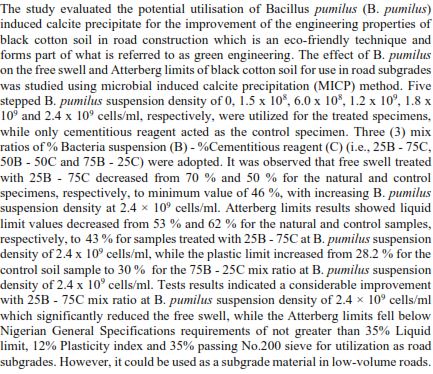 The effect of Bacillus Pumilus on the free swell and atterberg limits of black cotton soil for use in road subgrades