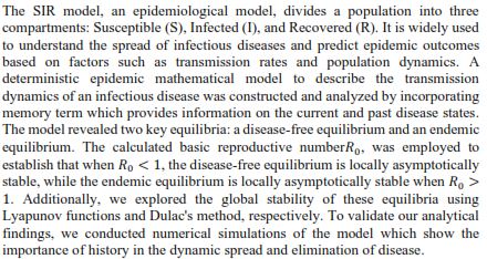 Epidemic Model, Memory term, Equilibria, Reproduction Number, Global StabilityAbstract