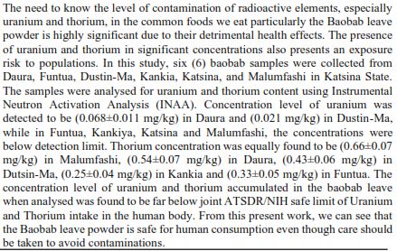 Uranium and Thorium contaminations of Baobab leave powder consumed in selected locations of Katsina state, North West Nigeria