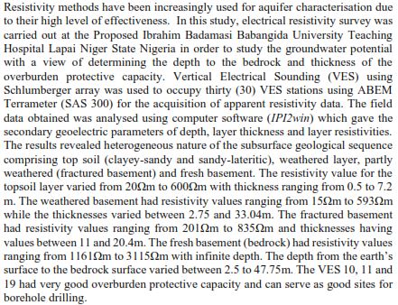 A. G., E., M. T., T., & T. U., Y. (2023). Resistivity prospecting for groundwater potential at the proposed Ibrahim Badamasi Babangida University Teaching Hospital, Lapai, Niger state. JOURNAL OF BASICS AND APPLIED SCIENCES RESEARCH, 1(1), 49-57. https://doi.org/10.33003/jobasr-2023-v1i1-22