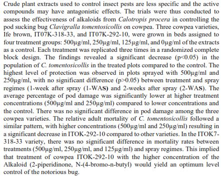 Assessment of plants Alkaloids isolated from calotropis Procera for managing pod sucking bug, Clavigralla tomentosicollis Stal (Hemiptera: Coreidae) infestation on Cowpea